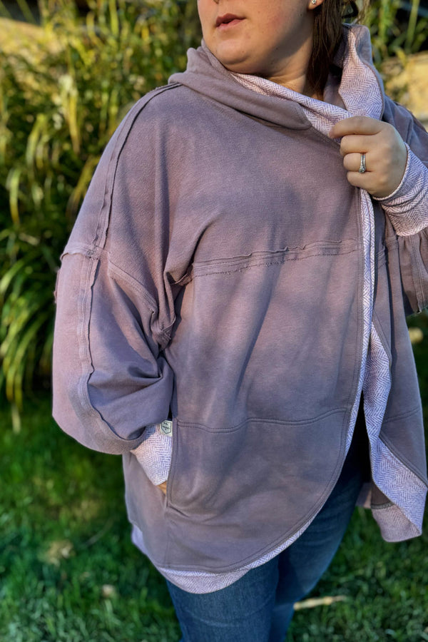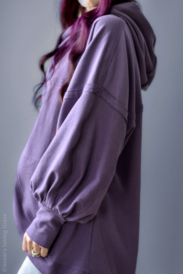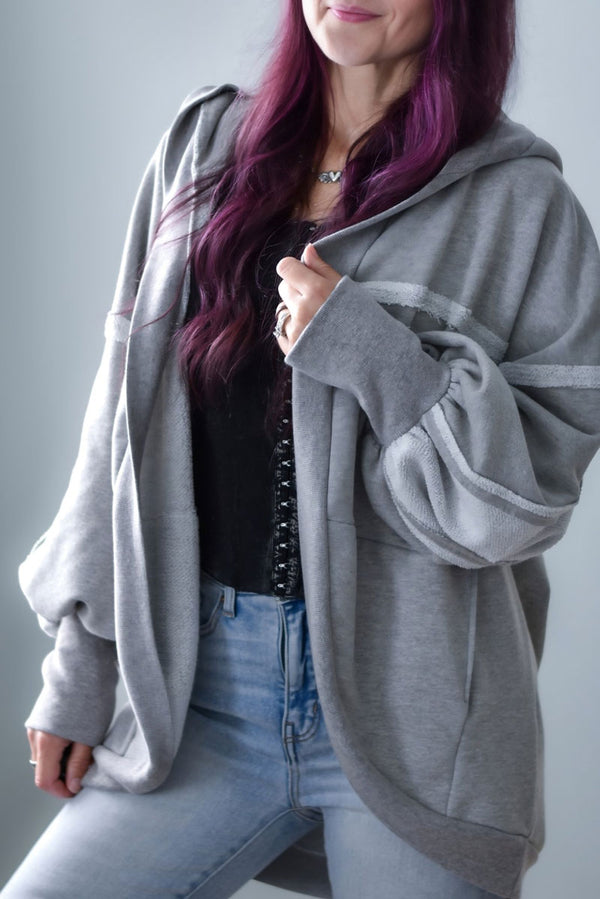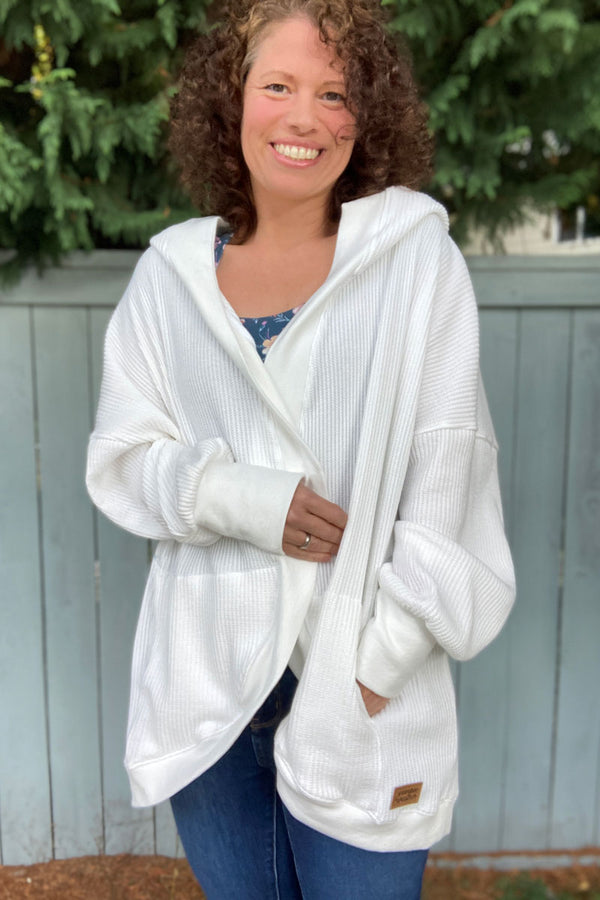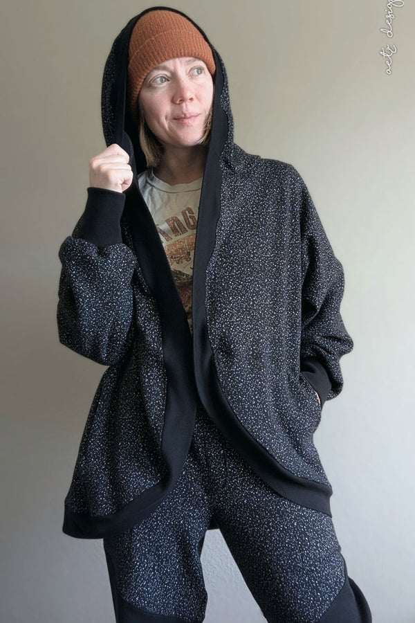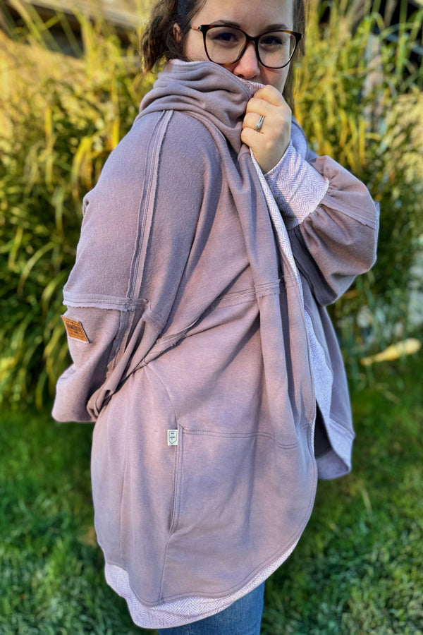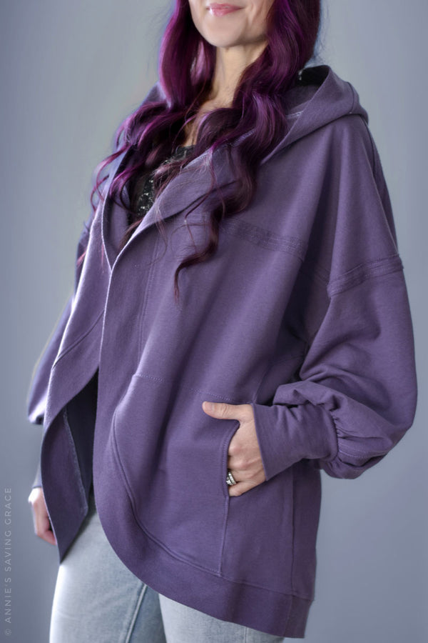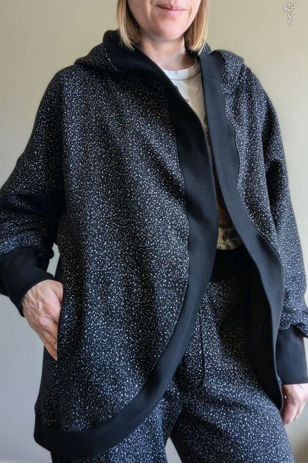 Ellis features an oversized fit for ultimate coziness! Dolman style sleeve options include wide bishop sleeves or a regular more slimmed down version. A deluxe hood adds both comfort and visual interest. The option for exposed or regular seams with color blocking or a simple version appeals to every taste and of course, we couldn’t leave out the option for pockets to hold your essentials or warm your hands!