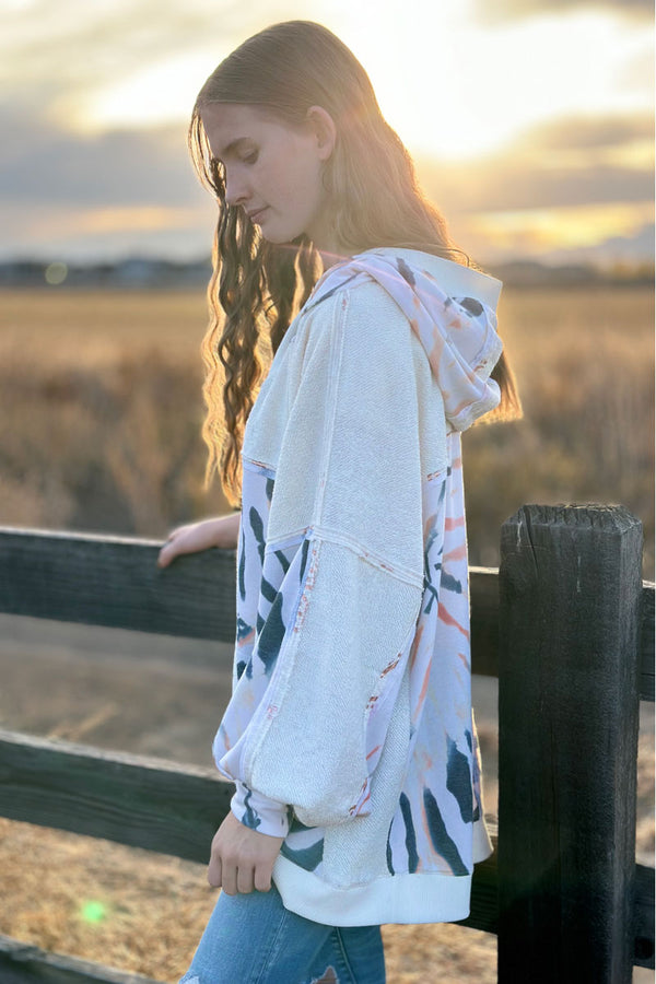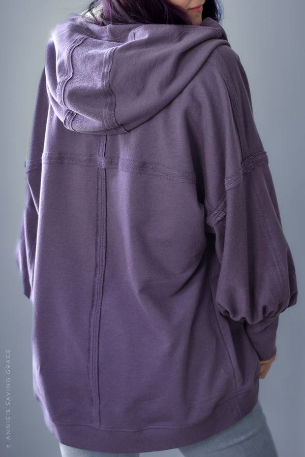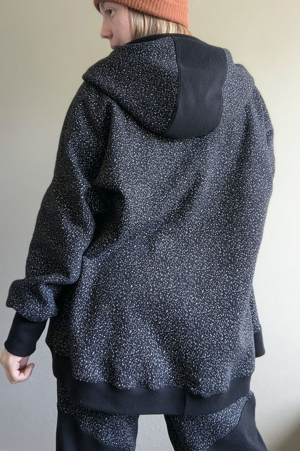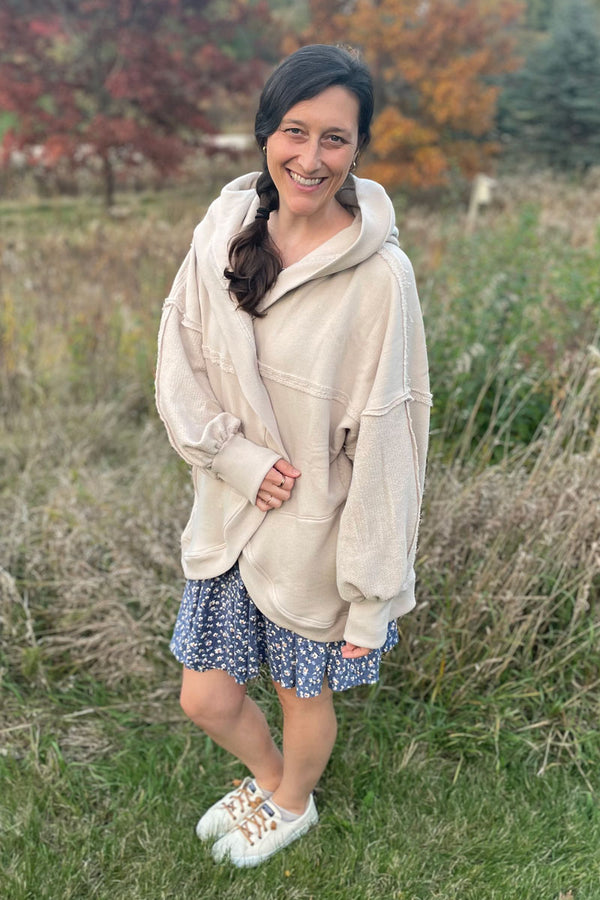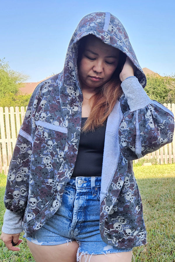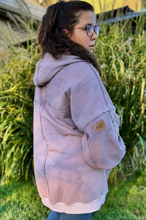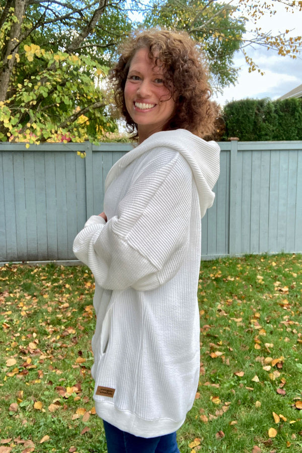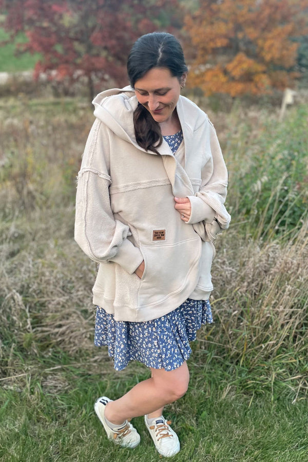Ellis features an oversized fit for ultimate coziness! Dolman style sleeve options include wide bishop sleeves or a regular more slimmed down version. A deluxe hood adds both comfort and visual interest. The option for exposed or regular seams with color blocking or a simple version appeals to every taste and of course, we couldn’t leave out the option for pockets to hold your essentials or warm your hands!