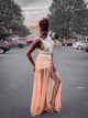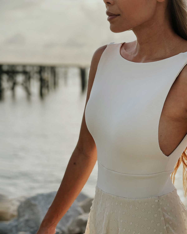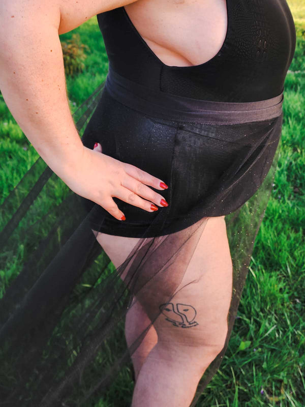 Jo features a chic side wrap bodice or low side bodice with optional flutter sleeves. There is an included shortie bottom that can be paired with the top, top and skirt, skirt only, or just by itself!