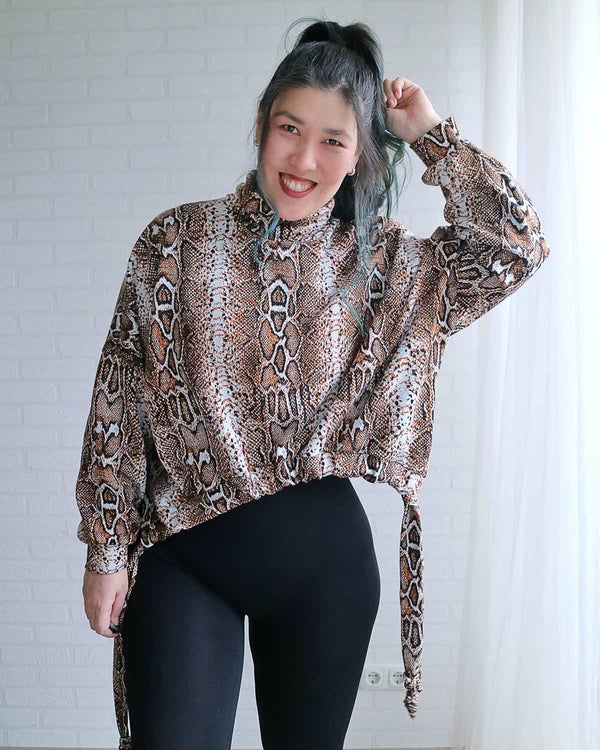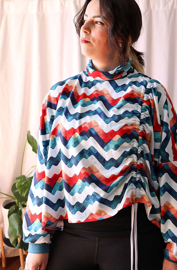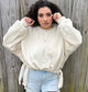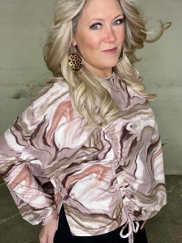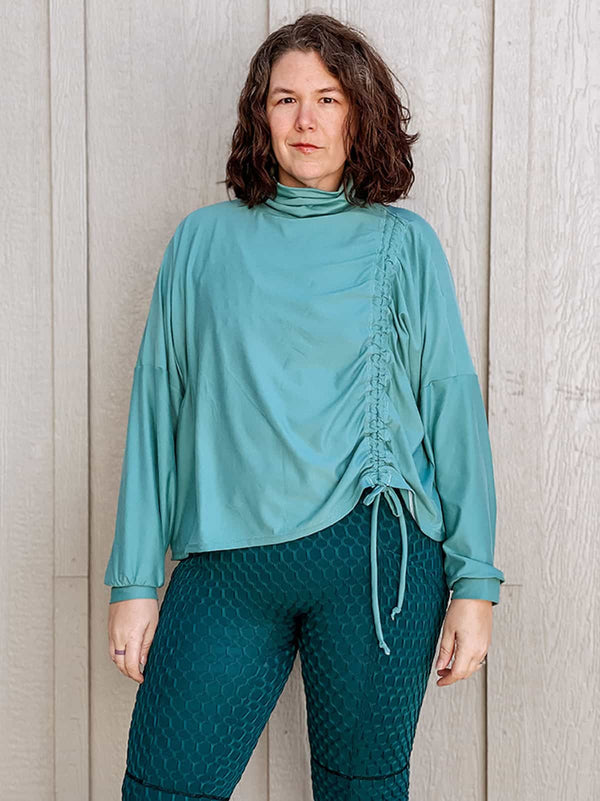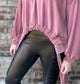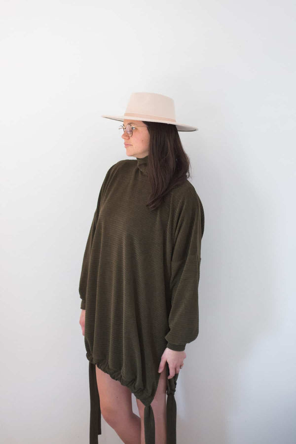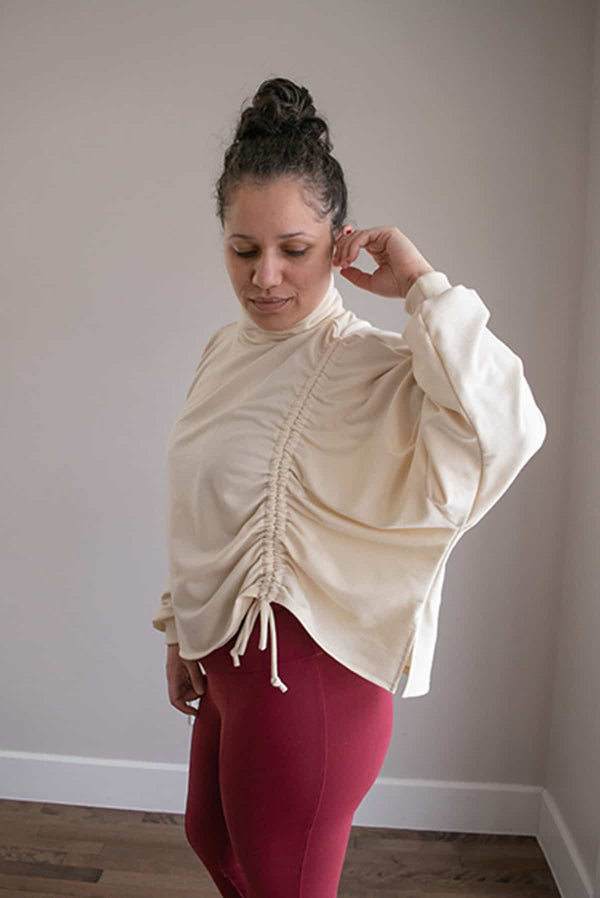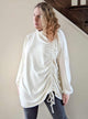 The perfect combination of cozy and chic, this oversized silhouette becomes the center of attention with its playful ruched details. The ties can be pulled tight in a bow or left loose and hanging, changing up the whole look depending on the mood.