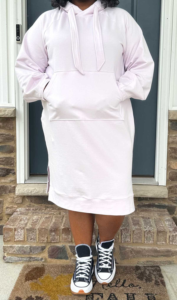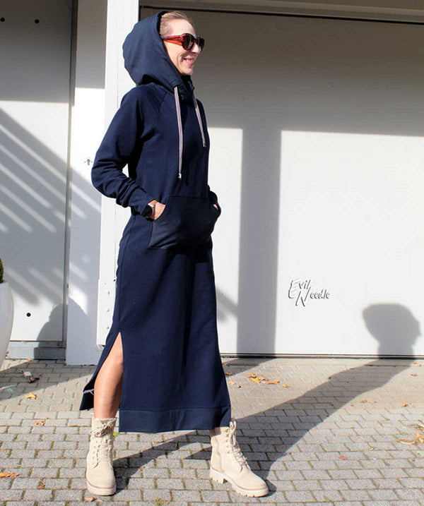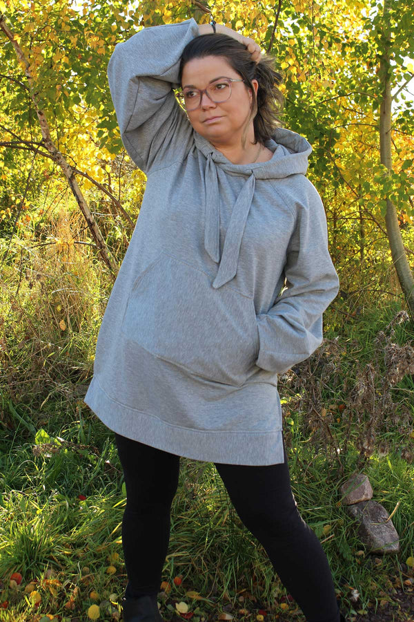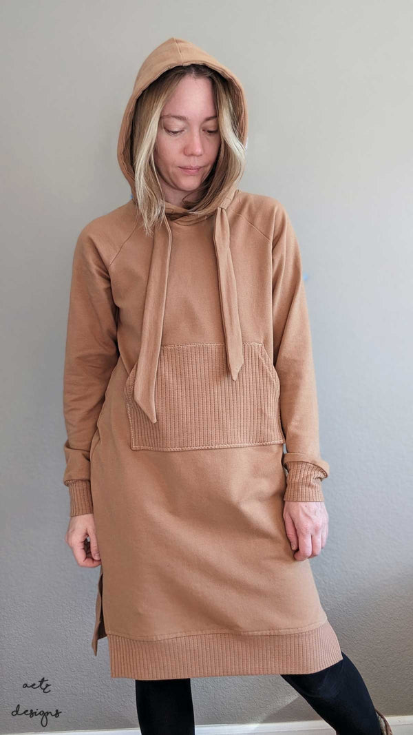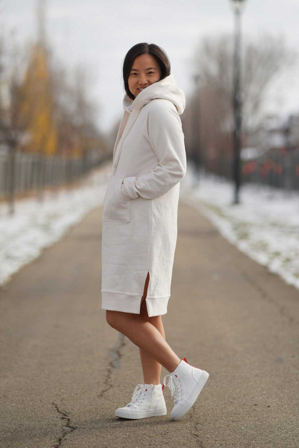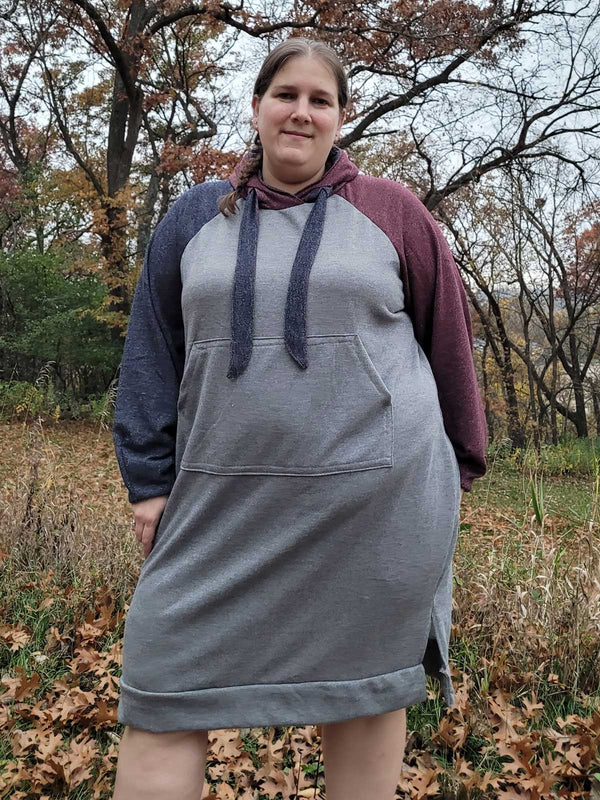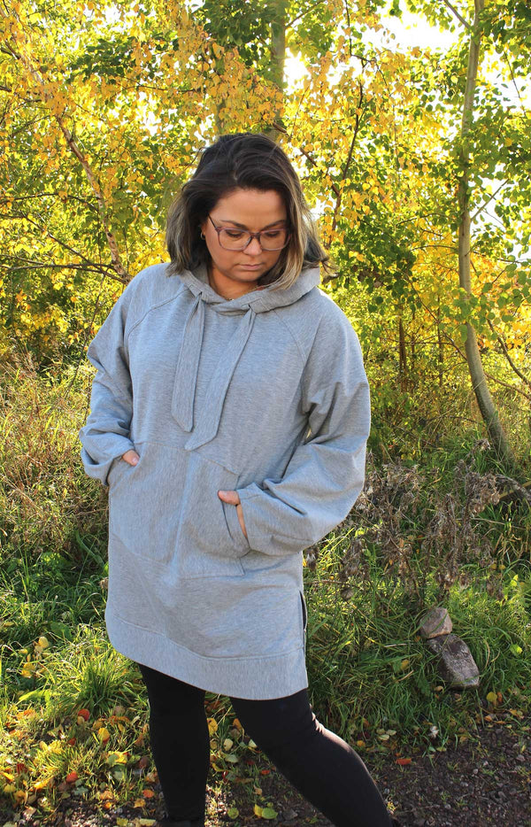 The Soto Sweatshirt & Dress is everything your fall and winter wardrobe has been missing! Soto features a raglan sleeve and a relaxed contoured fit throughout the body. The hood features a unique, easy to sew welt opening and a wide fabric drawstring. Soto has lengths from top to midi length dress and you can choose between a simple cuffed sleeve or a darted hem bishop sleeve.