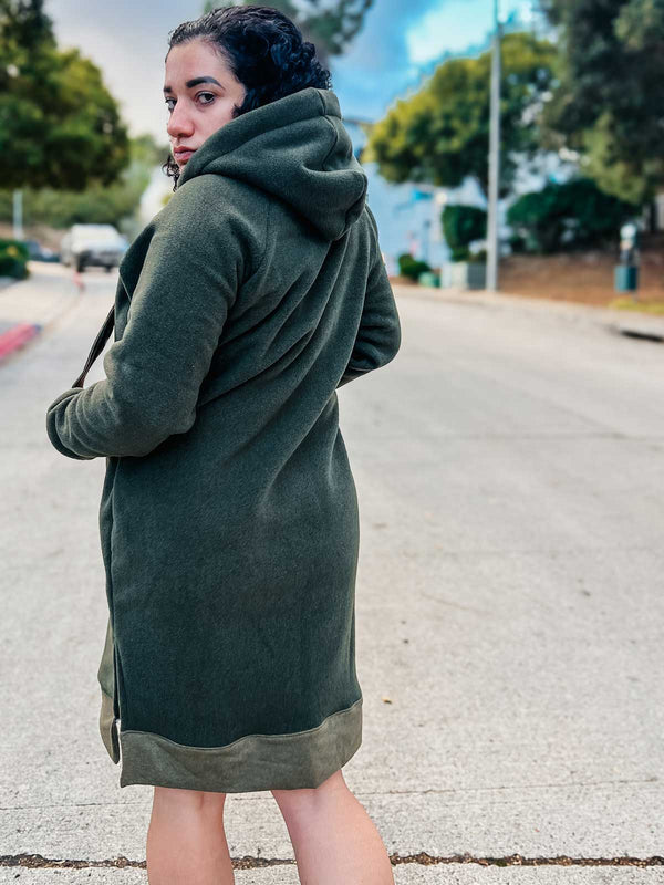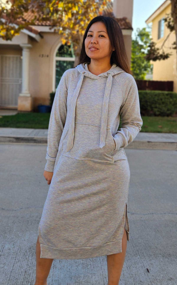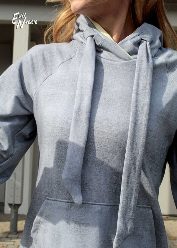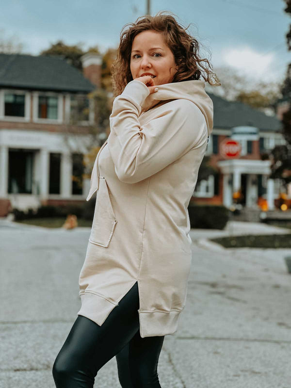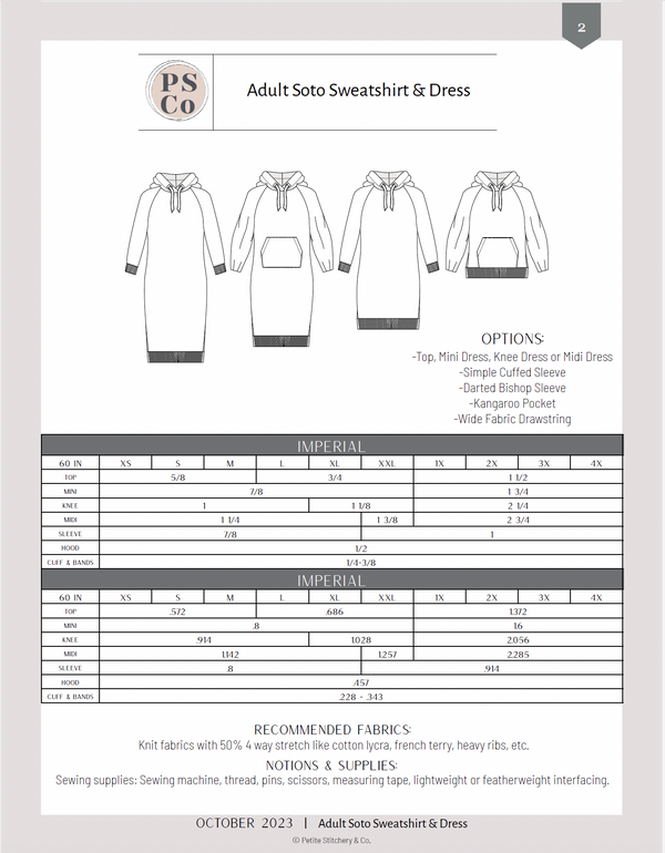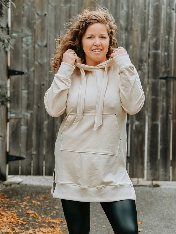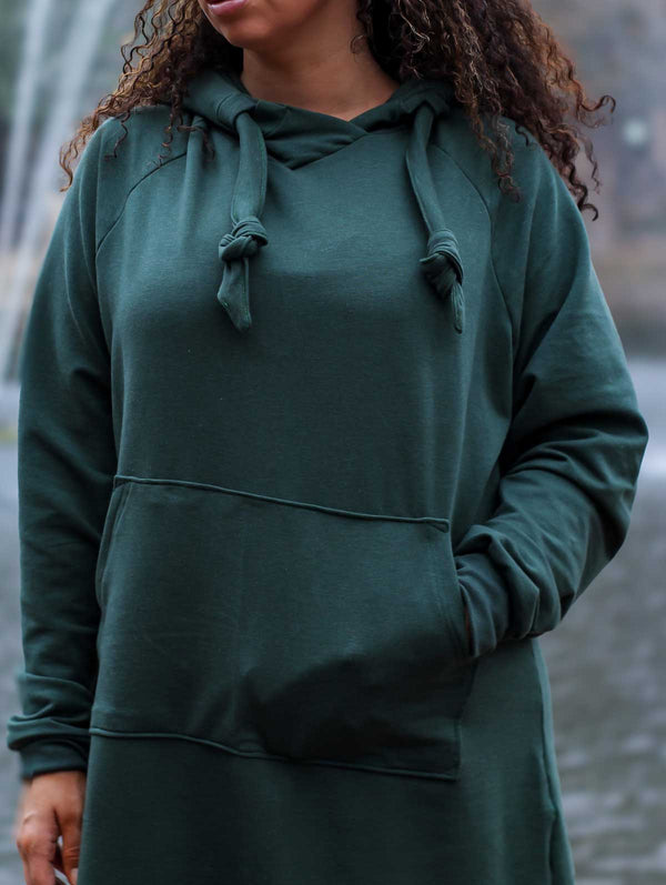 The Soto Sweatshirt & Dress is everything your fall and winter wardrobe has been missing! Soto features a raglan sleeve and a relaxed contoured fit throughout the body. The hood features a unique, easy to sew welt opening and a wide fabric drawstring. Soto has lengths from top to midi length dress and you can choose between a simple cuffed sleeve or a darted hem bishop sleeve.