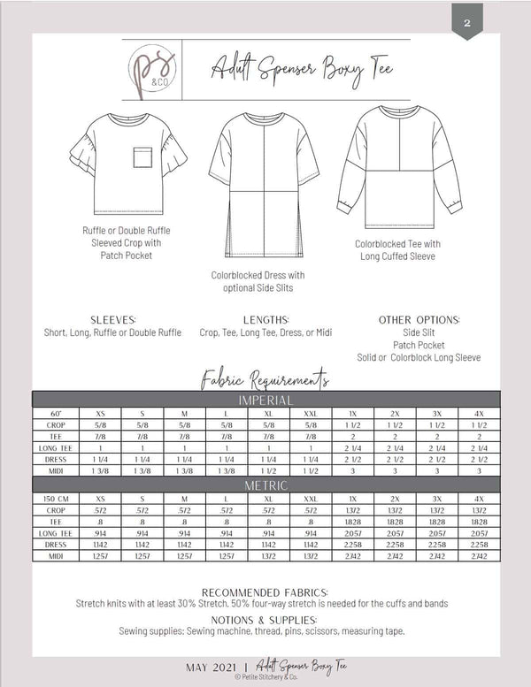 The Spenser Boxy Tee is just what the name implies- a boxy tee! It has a generous, oversized fit and a dropped shoulder. It comes in multiple lengths from Crop to Midi Dress and has different colorblocking and sleeve options that are great for scrap busting!