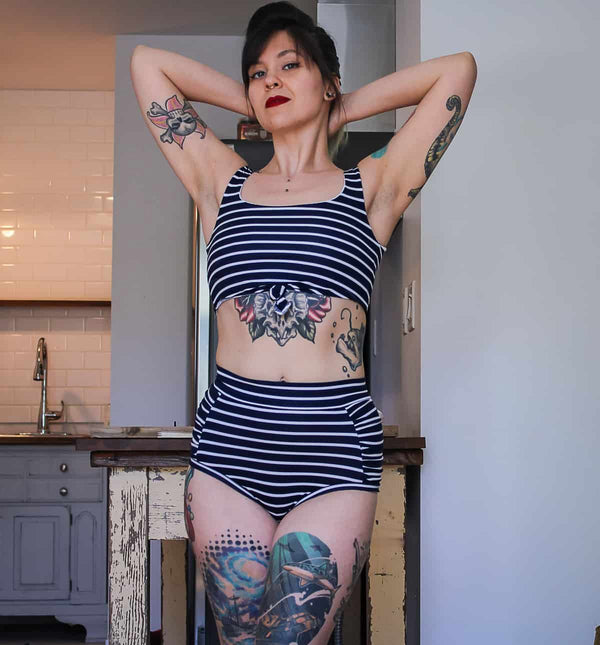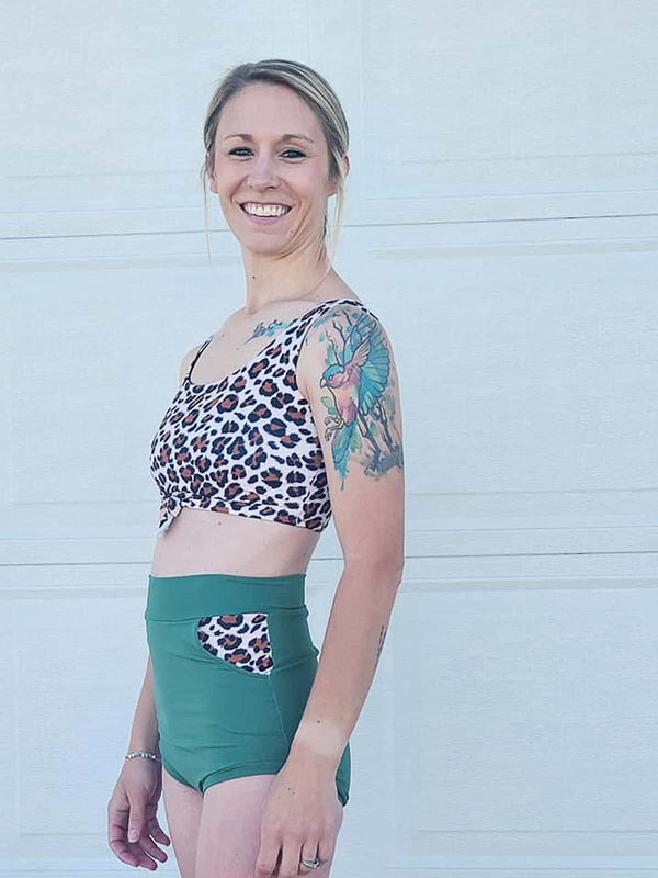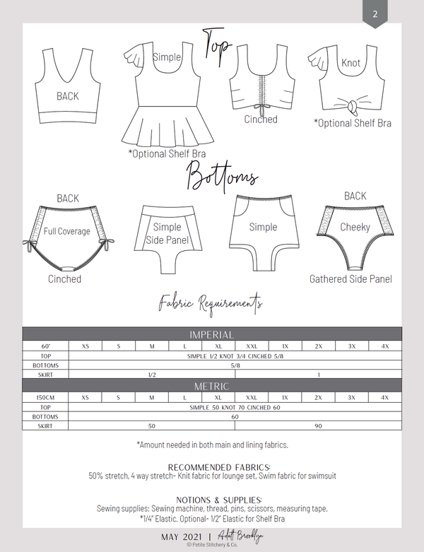 For the bottoms choose from: simple, simple panel, gathered panel or cinched panel! Brooklyn has 3 different rises- High, Mid and Low! Wear them Cheeky or Full Coverage! You can finish with elastic, add bands OR make them reversible! Don't forget, you can also add pockets!!