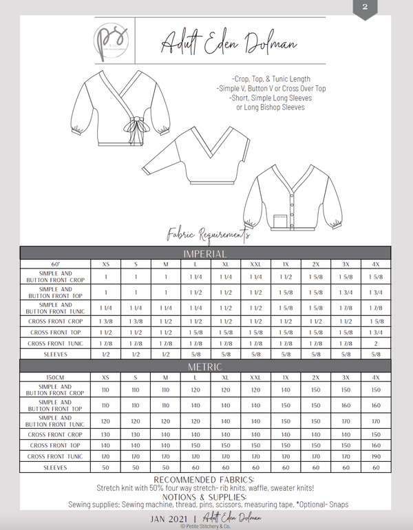 *Stretch knit with 50% four way stretch- rib knits, waffle, sweater knits! Please keep in mind, if a knit without the proper stretch is used it will alter the fit of the garment.