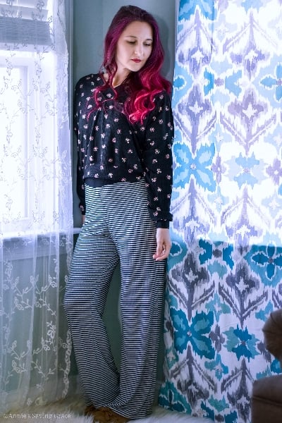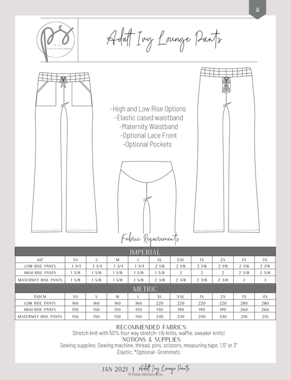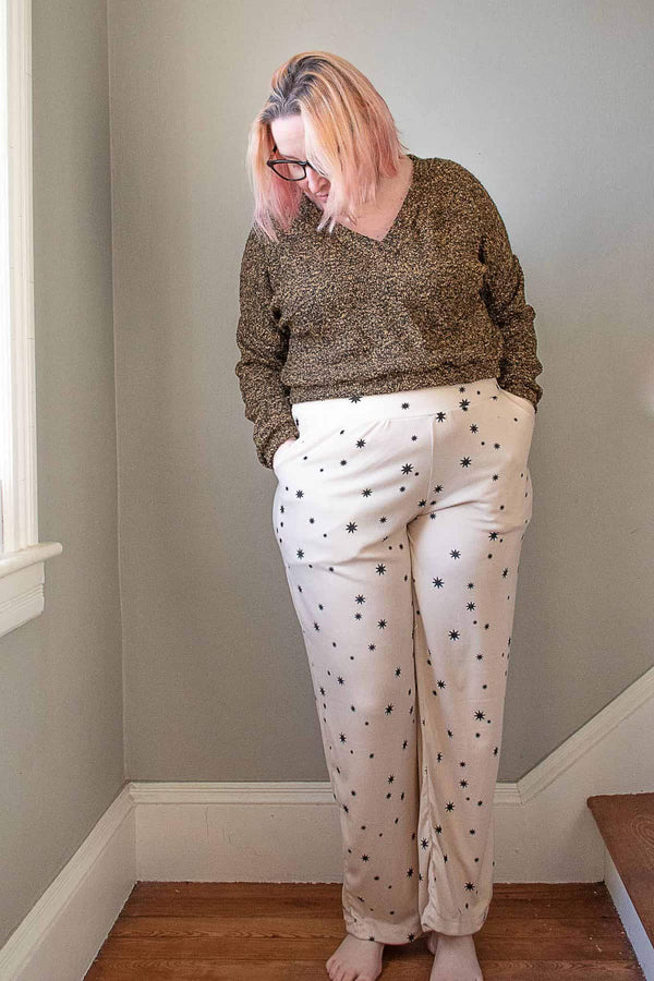 The Ivy Lounge Pants are the bottoms pattern we've been longing for---relaxed, comfortable, drapey, cute, and WITH POCKETS! This knit lounge pant pattern is perfect for those silky knits you've been saving for "just the right pattern". Now you can relax, unwind, hit the drive thru or pickup lanes whilst being comfortable and SUPER STYLISH! Want that extra something? Try the lace up panel! Wanna keep it simple? That's an option, too! Your legs will thank you!