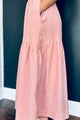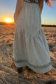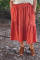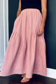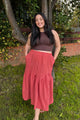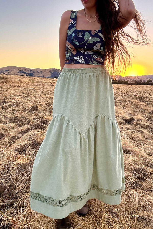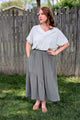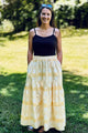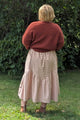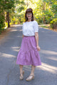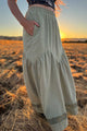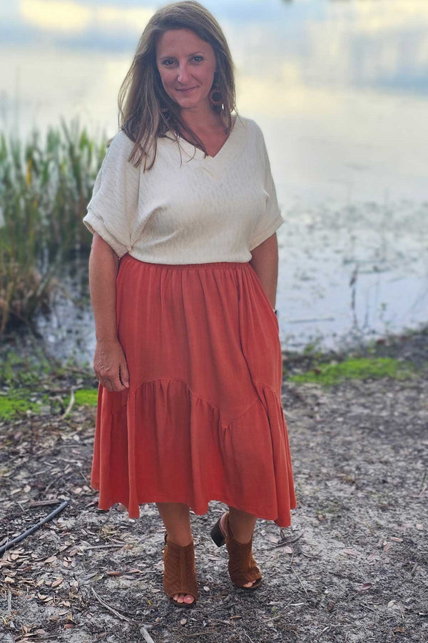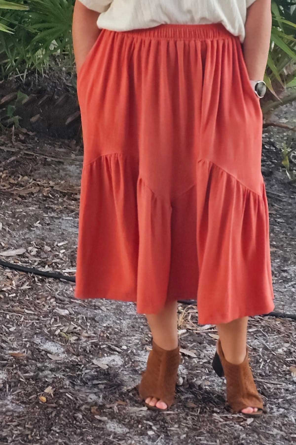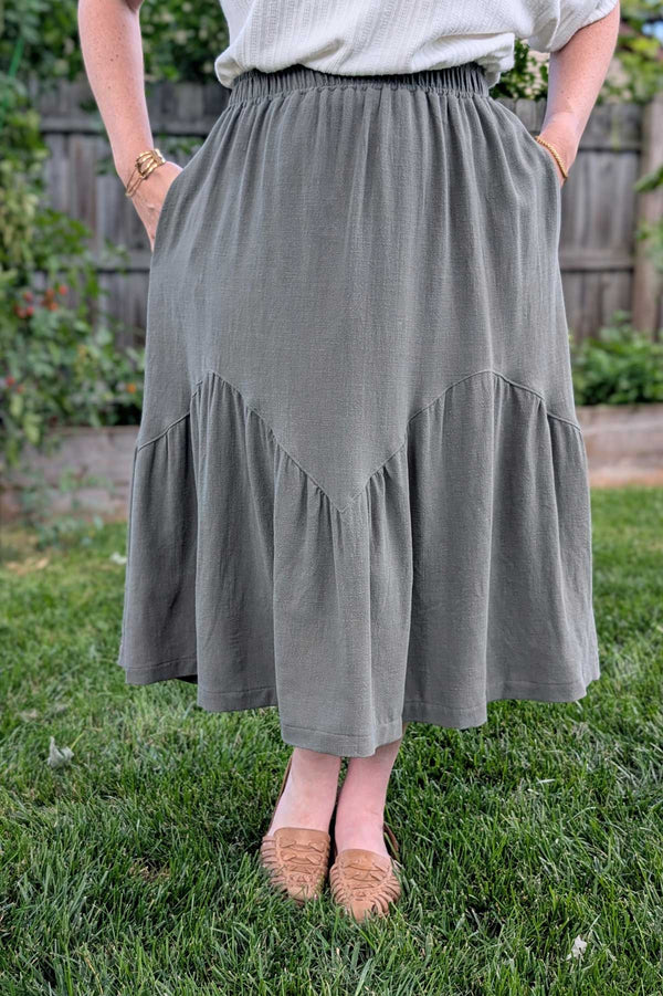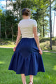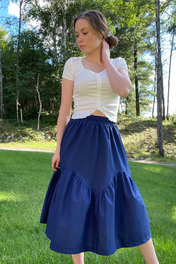 This pull on style skirt features a drop waist yoke detail with a gathered ruffle hem, inseam pockets, and an elastic waistband. With a high waisted fit, Leighton is perfect for pairing with your favorite cropped tees and sweaters.