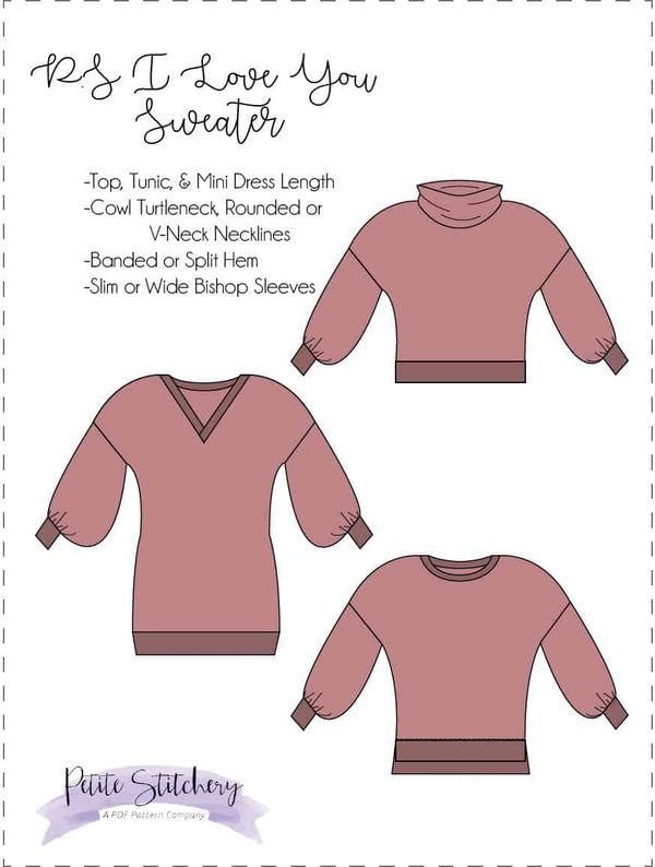 The PS I Love You Sweater is the go to sweater for the cooler months! With three necklines and three lengths, this pattern is super versatile. The bishop sleeves come in both wide and slim fits and are super trendy right now! If you like cozy fashion then the PSILY is for you!