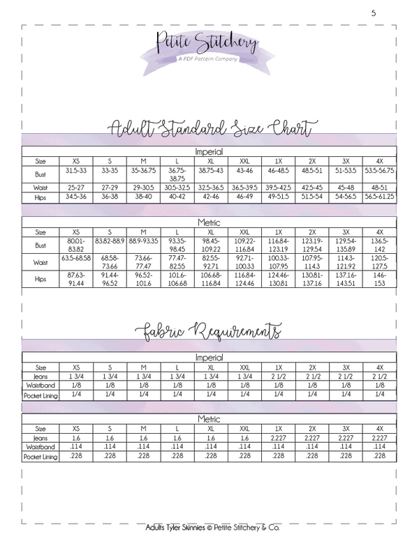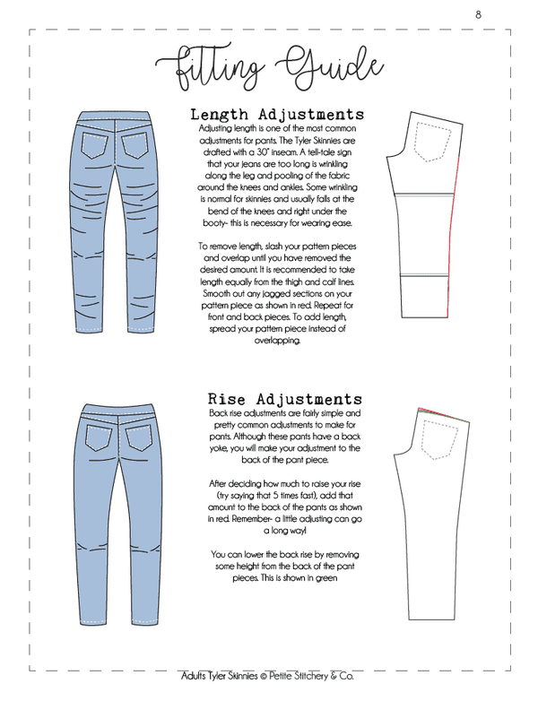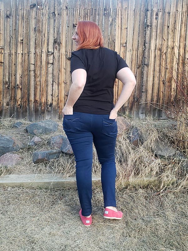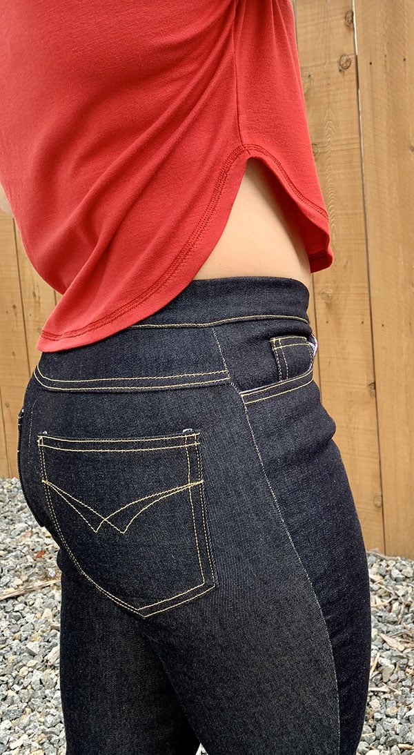 The Tyler Skinnies are the essential pull-on style jeans for all! The details make them look like jeans but the stretch fabric will make them feel like loungewear! The Tyler Skinnies feature a faux front fly with options for a faux button elastic waistband. There are 5 fully functional pockets on these jeans- because you know- snacks! Gone are the days of RTW jeans that never fit, use the fitting guide in the pattern to get the perfect fit for your skinnies. Trust me, your booty will thank you <3