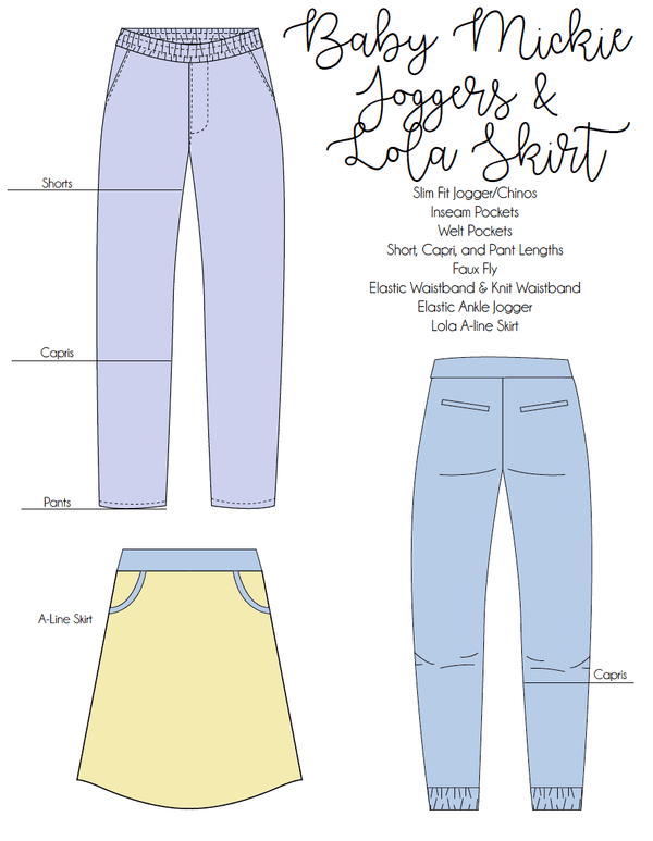 Meet Mickie, the only pants pattern you'll ever need! So probably the best part of this pattern is that there are options for both knit and woven fabrics. Plus there is a bonus pattern included for the Lola Skirt- which is a sweet little A-line skirt! So let's talk about some of these options: