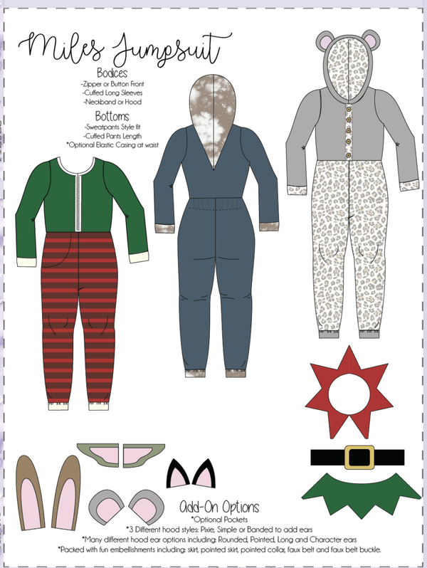 Miles is a unisex jumpsuit or romper pattern for the whole family with options galore! It features a relaxed fit, and is perfect for all those holiday-inspired outfits you've got planned! You can customize it with various hood and other add on options, "ears" for that extra cuteness factor and so much more! Check out some of the options below!