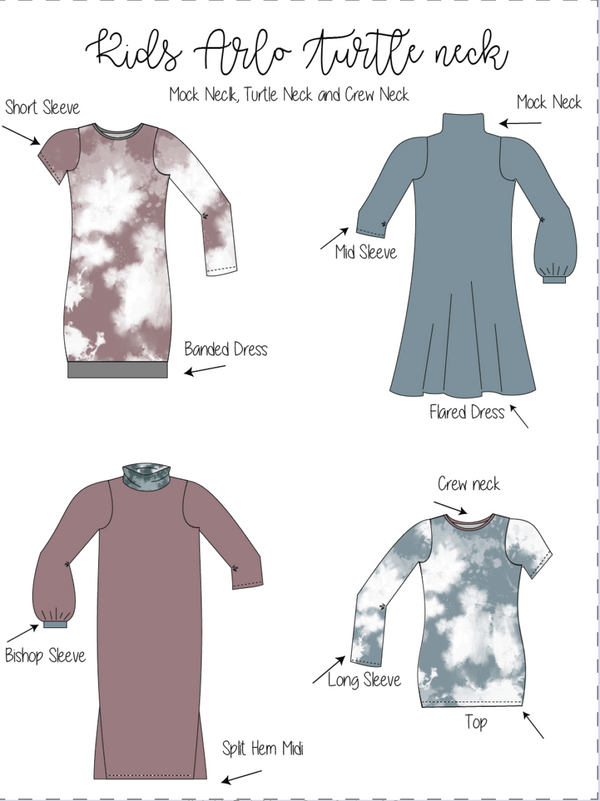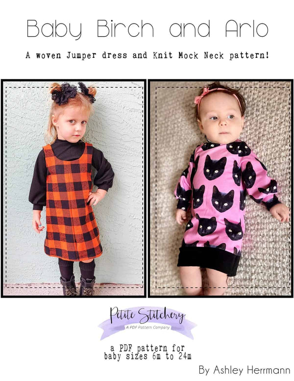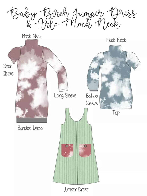 As an added *bonus*, the Kids pattern also includes a download for Baby Arlo & Birch in sizes 6m-24m! So your little littles can be super cute as well! [Note: Baby Arlo & Birch includes ONLY the Mock neck variation of a Arlo and ONLY the Jumper Dress version of Birch. Not all options offered for kid sizing are reflected for the baby sizes.]