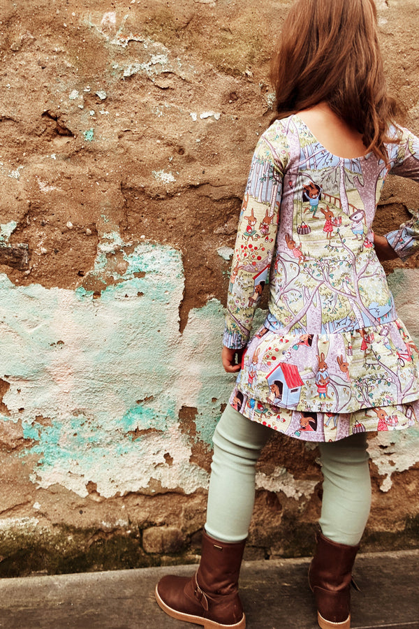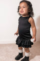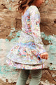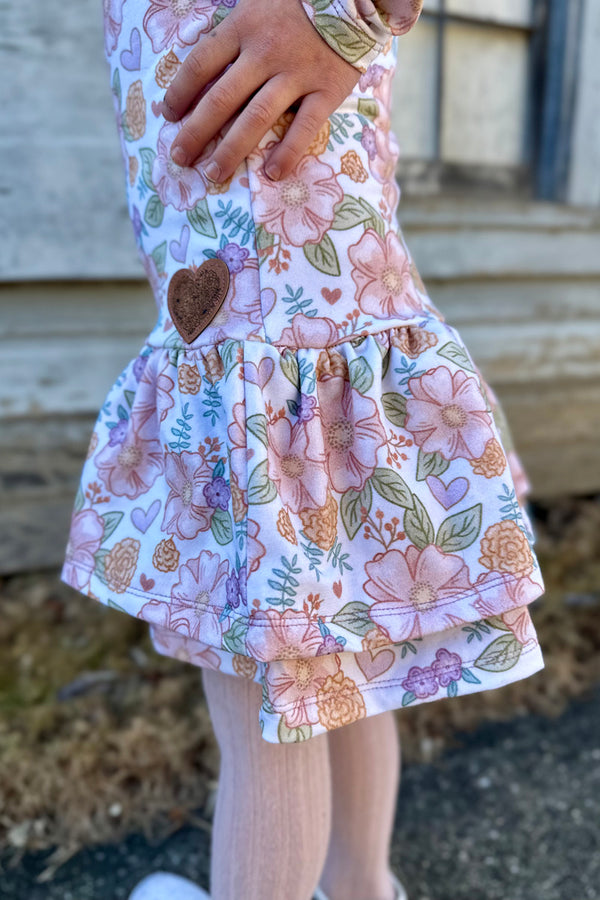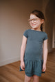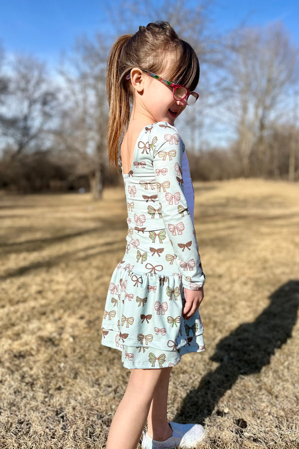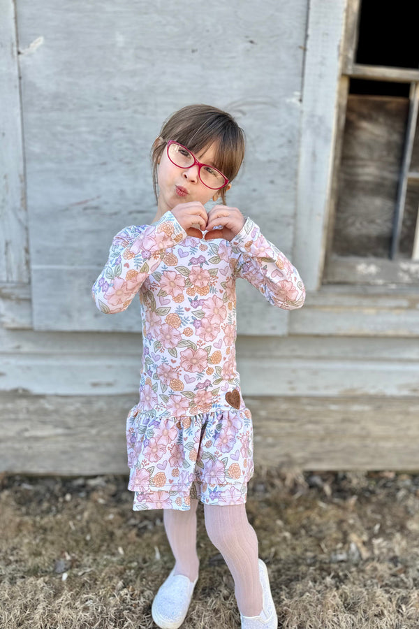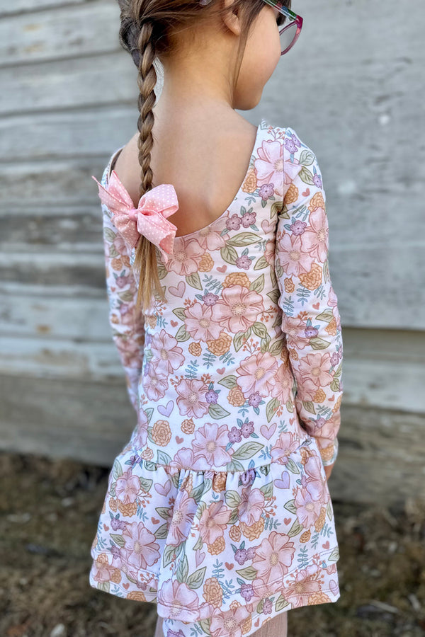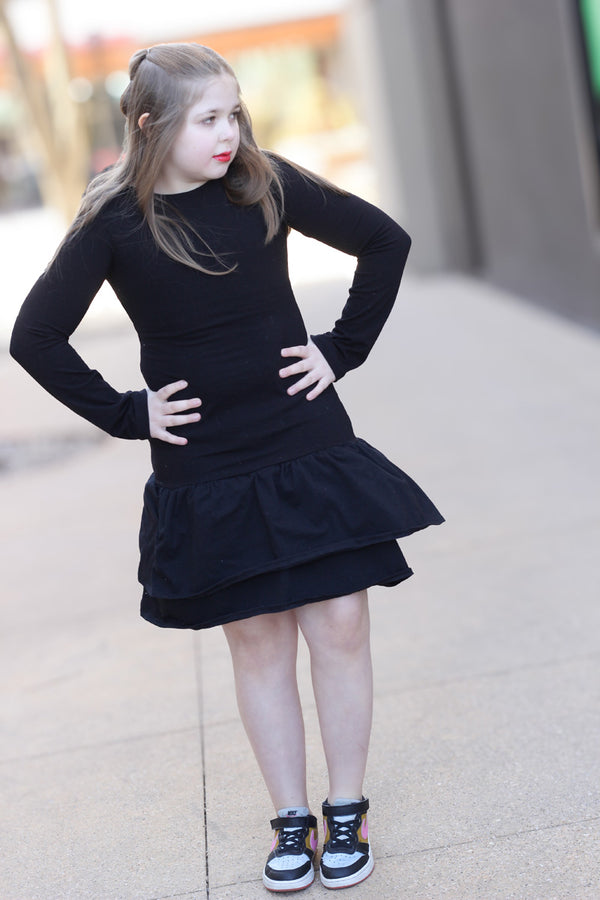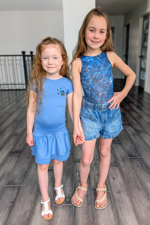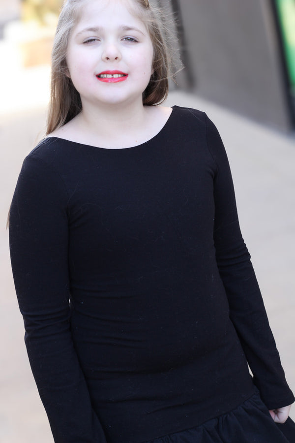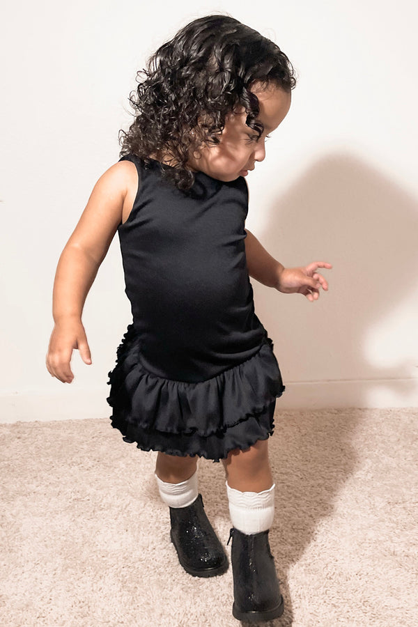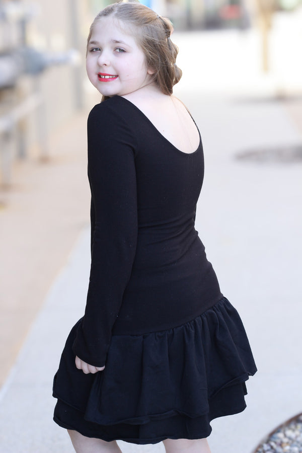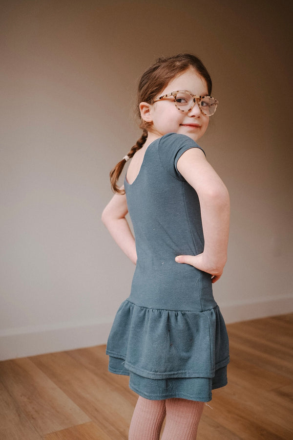 Kaia’s drop waist contrasts perfectly its tiered ruffle skirt detail creating a playful silhouette! Choose sleek fitted sleeves, a cap sleeve or go sleeveless! A moderate or deep scoop back create further interest and a bodysuit options provide endless styling possibilities!