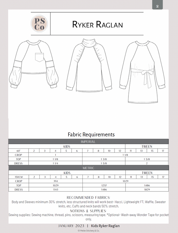 Ryker is the newest Raglan to join the Petite Stitchery & Co line up! The Ryker Raglan is filled with options in true PSCo form! Style, comfort and ease of construction will be the key to your heart with the Ryker Raglan.