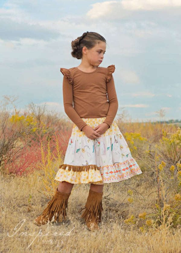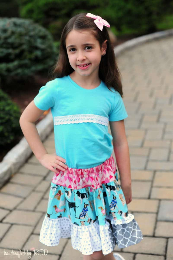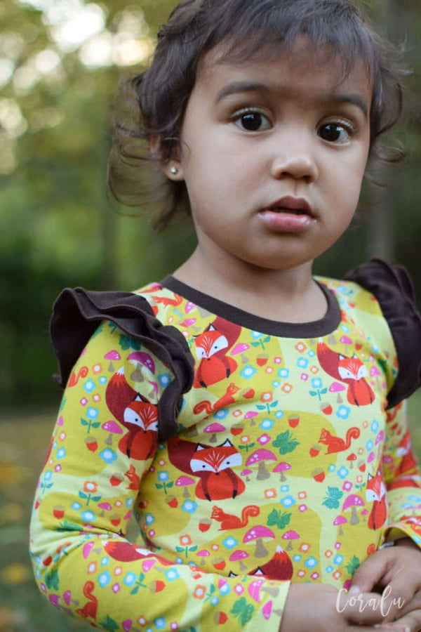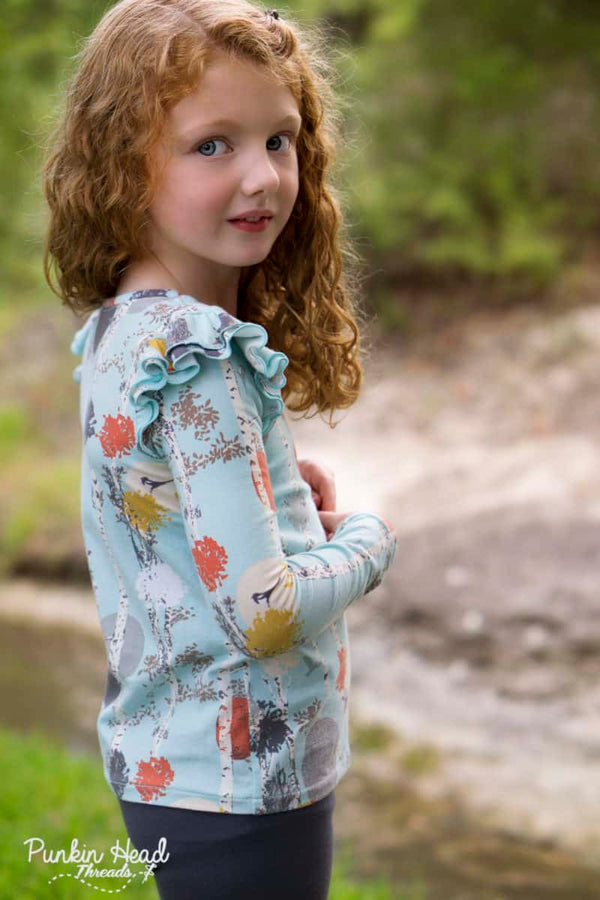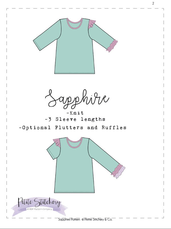 The Sapphire pattern is a knit layering top full of options. There are 3 different sleeve lengths. You can choose to add adorable accents like flutters to the shoulders or ruffles to the arms. This top is perfect by itself or as an adorable layering piece.