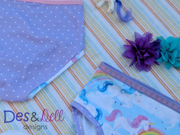 The Sunshine Skivvies are sure to please your little one. These one piece undies are lightening fast and an excellent scrap buster! Choose between either high or low rise and also between knit and elastic bands, making these easy to customize.