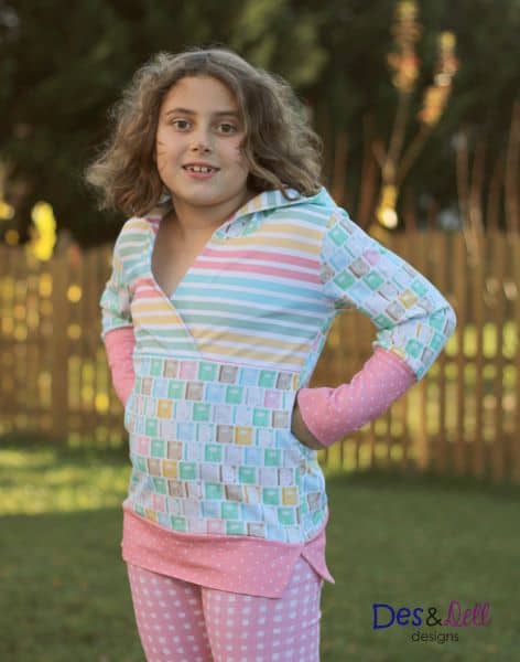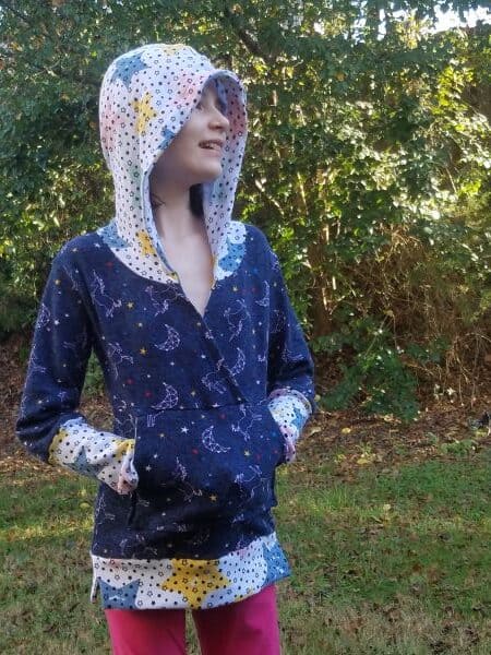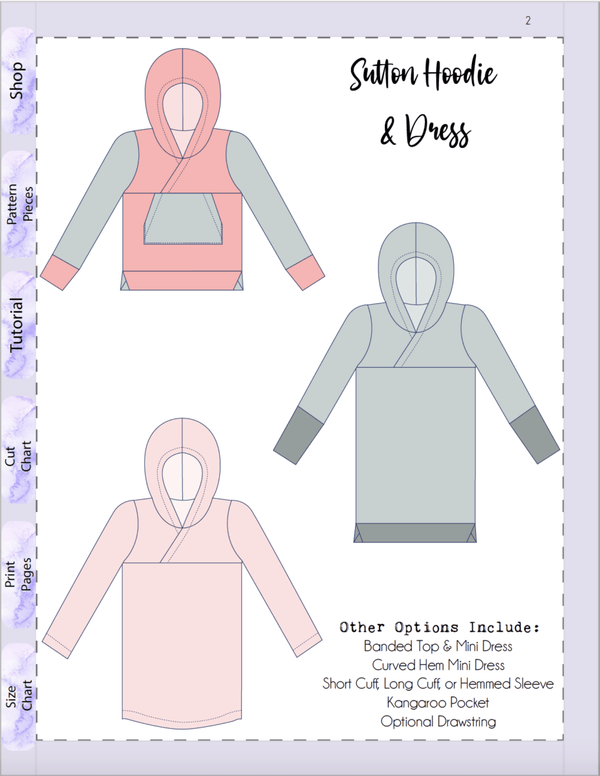 Sutton is a semi-fitted, cross-front style hoodie with a lil' flare to give it just the right amount of extra! The bodice has the crossover V which works well enough on its own or can be layered over lightweight clothing. Various lengths with a split band or mini dress option with a curved hem provide the perfect transitioning top/dress as the mercury falls!