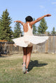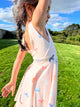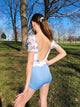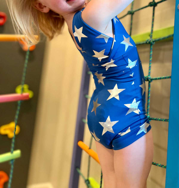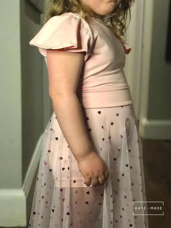 Jo features a chic side wrap bodice and optional flutter sleeves. There is an included shortie bottom that can be pair