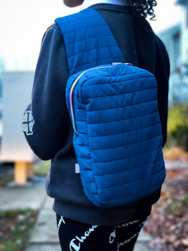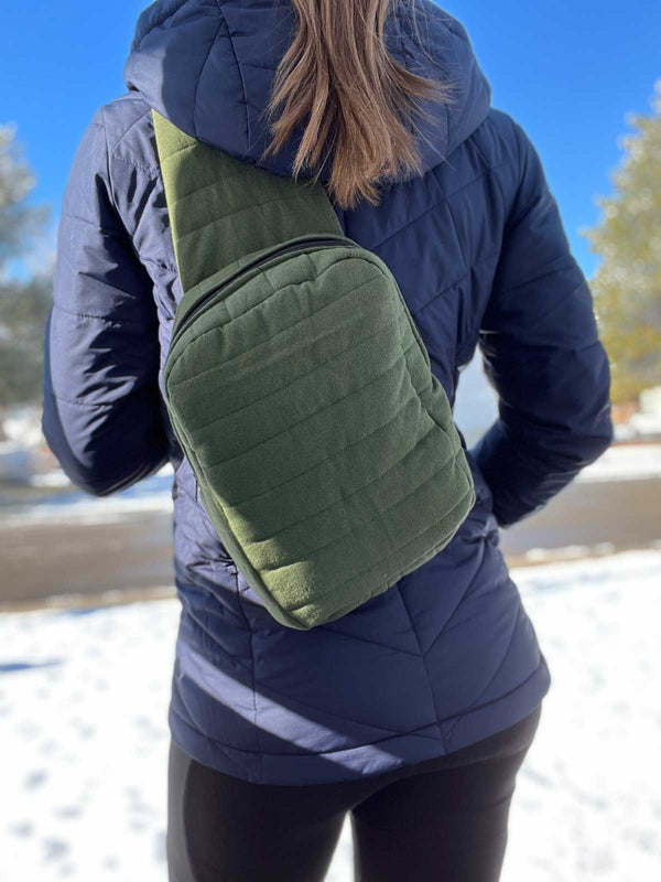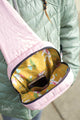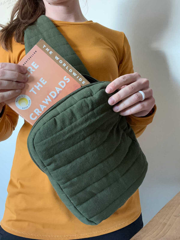 This sling style freebie bag can be worn on the front or on the back and is big enough to carry all the essentials! There is an optional inner pocket and instructions for adding your own quilting details.