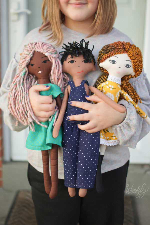 This beginner friendly pattern provides the framework for what we are sure will be a ton of beautiful handmade dolls! Dahlia is a woven rag doll pattern that you can customize from head to toe! You can select your fabrics, face design, hair style, and hair color/texture by exploring different types of yarns!