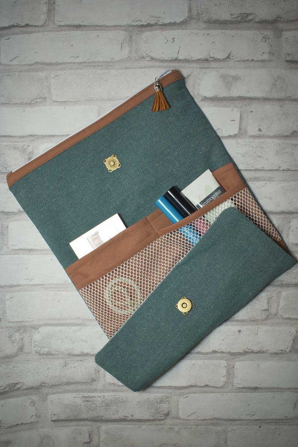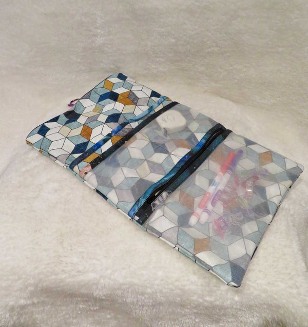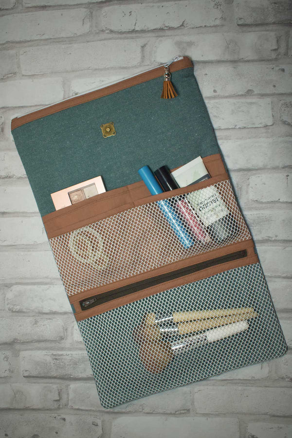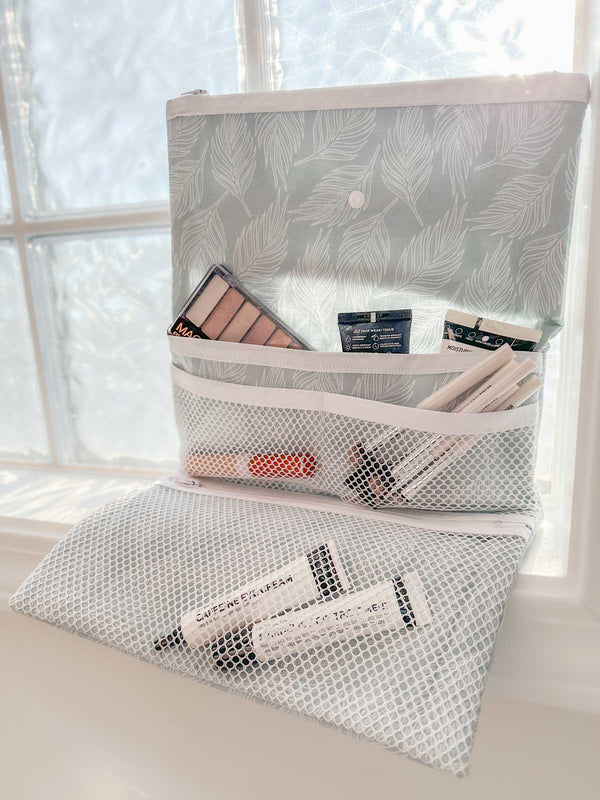 This tri-fold pouch is perfect for organizing your essentials on the go! Pembrook contains 5 different pockets for storing all your stuff: a top zippered pocket, a fabric pocket and double mesh pocket on the middle tier, and a zippered mesh pocket on the bottom. Pembrook folds up and secures with a snap, making it the perfect size to toss in your purse, backpack, or luggage!