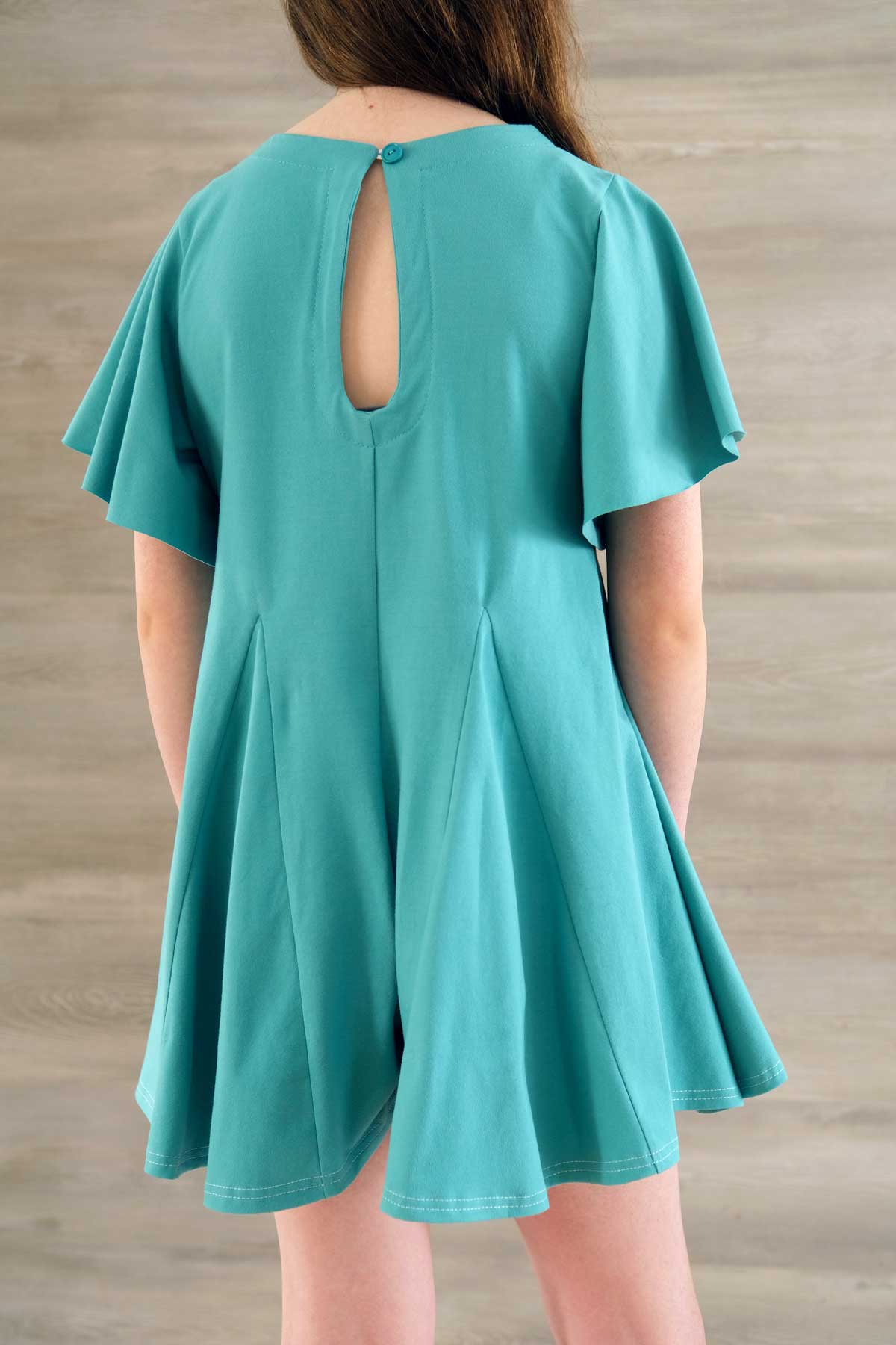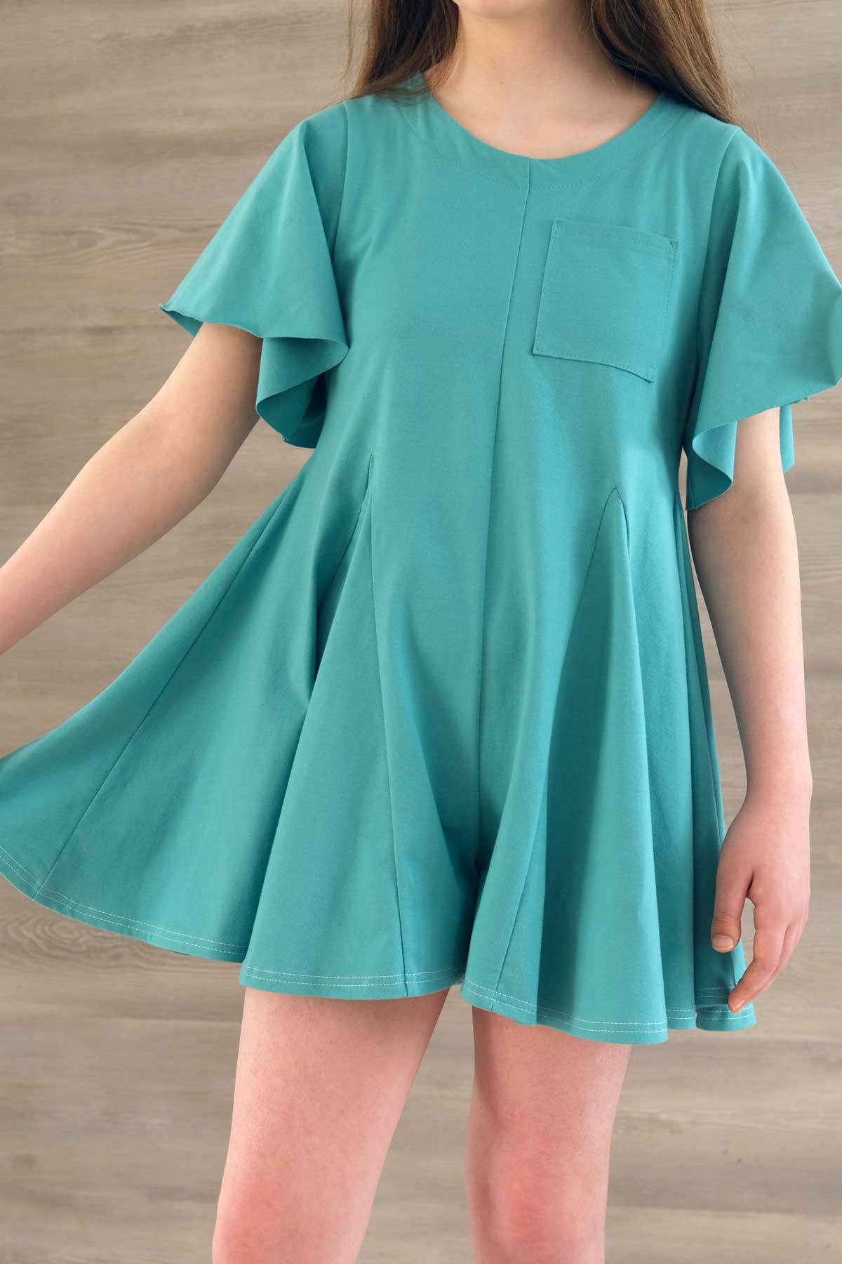 The bodice features a classic crew neckline and flows into flared shorts with godets for added fullness and a skirt-like look. Choose from tank, flutter, ¾ sleeve, or long bell sleeve options to create everything from a casual everyday romper to a statement warm-weather outfit. The keyhole back allows for easy on and off, and the optional chest pocket adds a fun finishing touch.